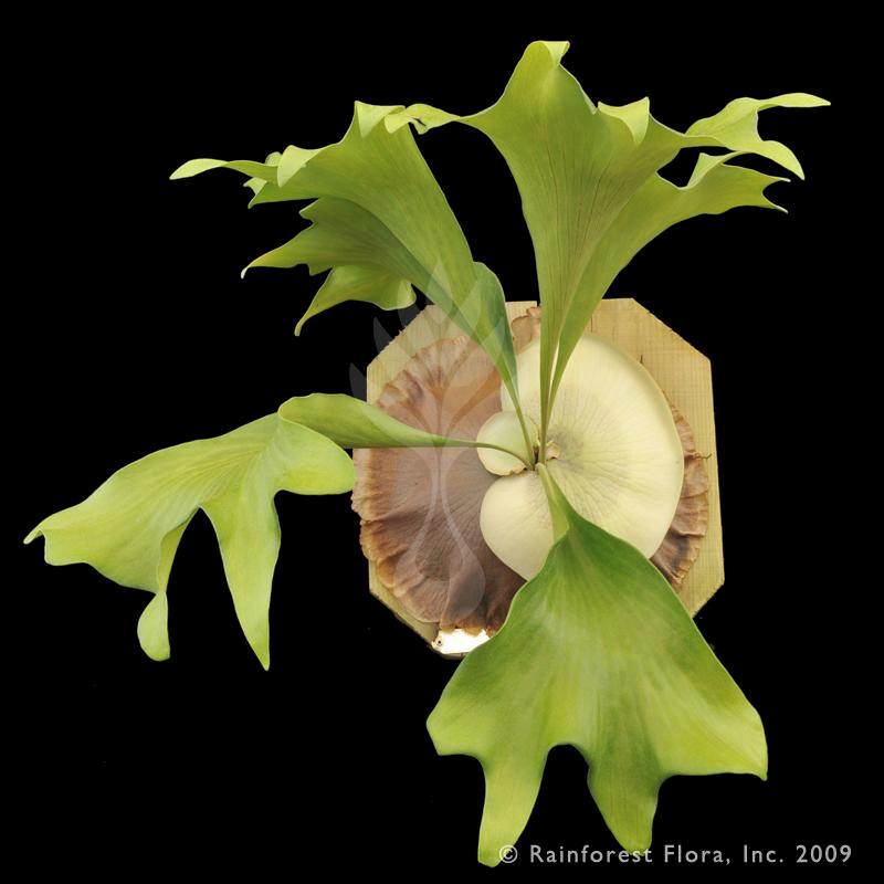 inches across and 34 inches long.P. ellisii is unique from other platys in their shield fronds develop wide spaces up to an inch between the shield fronds. Roy Vail suggests stuffing sphagnum moss in these spaces to help retain water. The shield fronds are not a good storage vehicle for water, and the fertile fronds are thin, so the P. ellissii must require a high humidity with solid shade. Roy Vail suggests the function of the shield frond space is unknown, but it appears it needs to dry out quickly if excessive rain is present. Since it dries out quickly, it supports the idea that platys get a lot of their moisture from dew and high humidity. The Platycerium ellissii is challenging to grow well in cultivation |