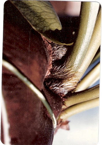The image on the left is a cut away of the shield frond showing the enormous gaps between the shields. This configuration is unique to only P. ellisii. The space makes it difficult for the shield fronds to retain water as they will dry out fast. However if they are native to a wet rainy area like the mangroves of eastern Madagaagar where the humidity is always high, the space might prevent rot from killing the P. ellisii. Another argument is that the space provides a nice home for insects that die and provide nourishment for the plant.
