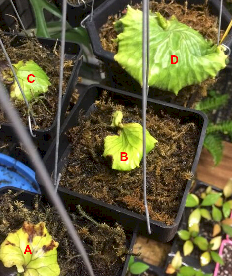 Each plant is labeled, A, B, C, D. The first 3 are in 4 inch orchid