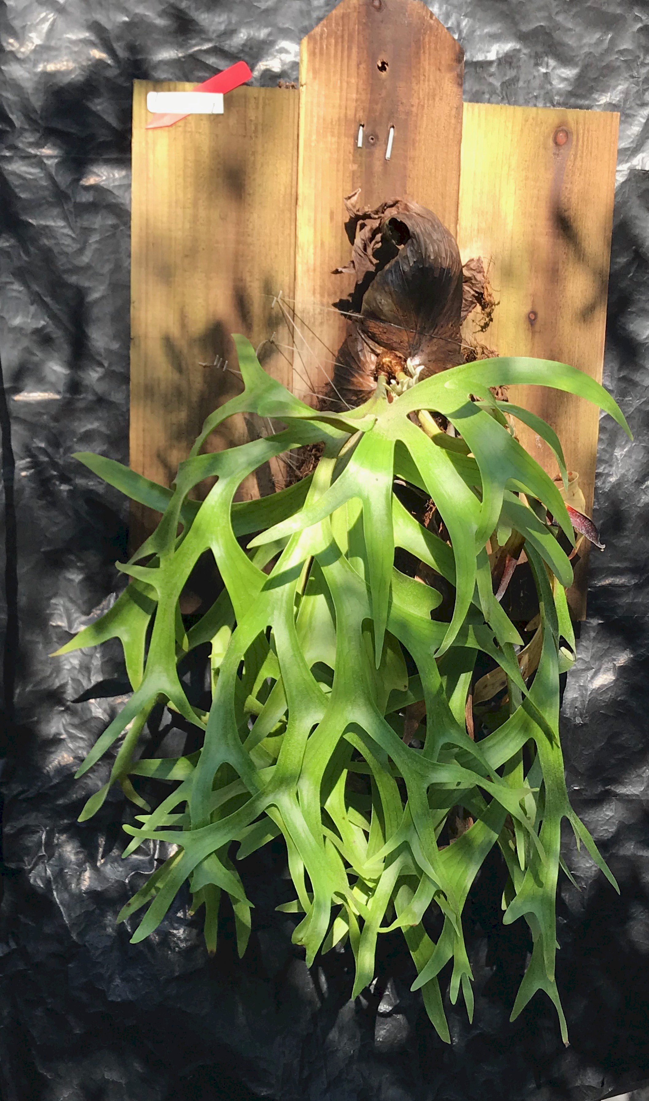 The photo on the right of a Mt Kitshakood was borrowed from "Platycerium Ferns" You can see the P. ridleyii trait in the shield frond. The fertile fronds hanging down are more a P. coronarium trait. P. ridleyii fertile fronds stand erect like a bouquet of flowers. P. ridleyii have pods with spore patches and I don't see any pods or spore patches on the fronds like P. coronarium. P. coronarium tend to grow volunteers horizontally from the bud and I don't see any volunteers yet on any P. Mt Kitshakoods.