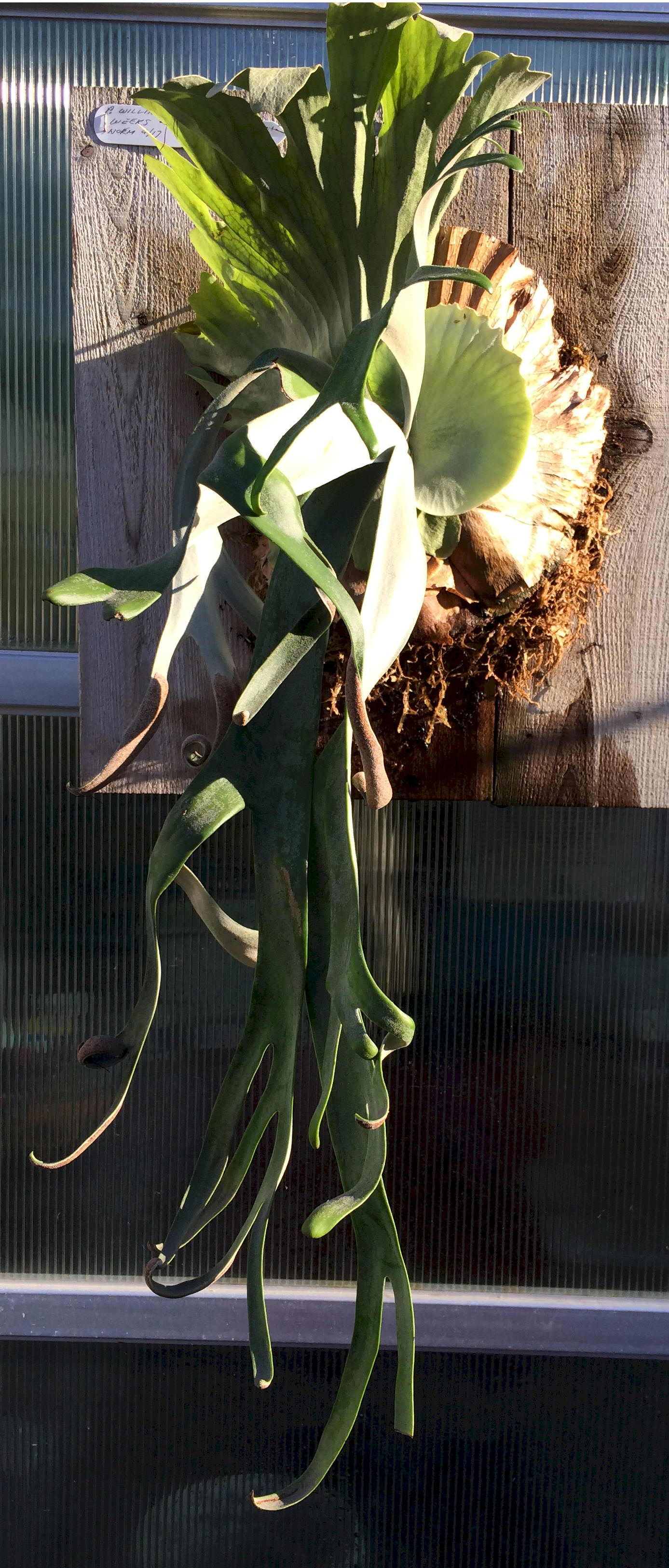 The Platycerium willinckii 'Schofield' (left & right) is documented in Wendy Franks book, but not Roy Vail's or Barbra Joe Hoshizaki's books. Longwood Gardens also claims to have one. It is named after a former grower Glen Schofield. This cultivar has very long and deeply lobed fertile fronds. We just picked one up from Larry McCullah, long time member of the Los Angeles International fern Society and the length of the fertile fronds must be 48 inches. We had to divide it up to move it and I was given one of the pups. I mounted it on a large 18x24 inch redwood board.