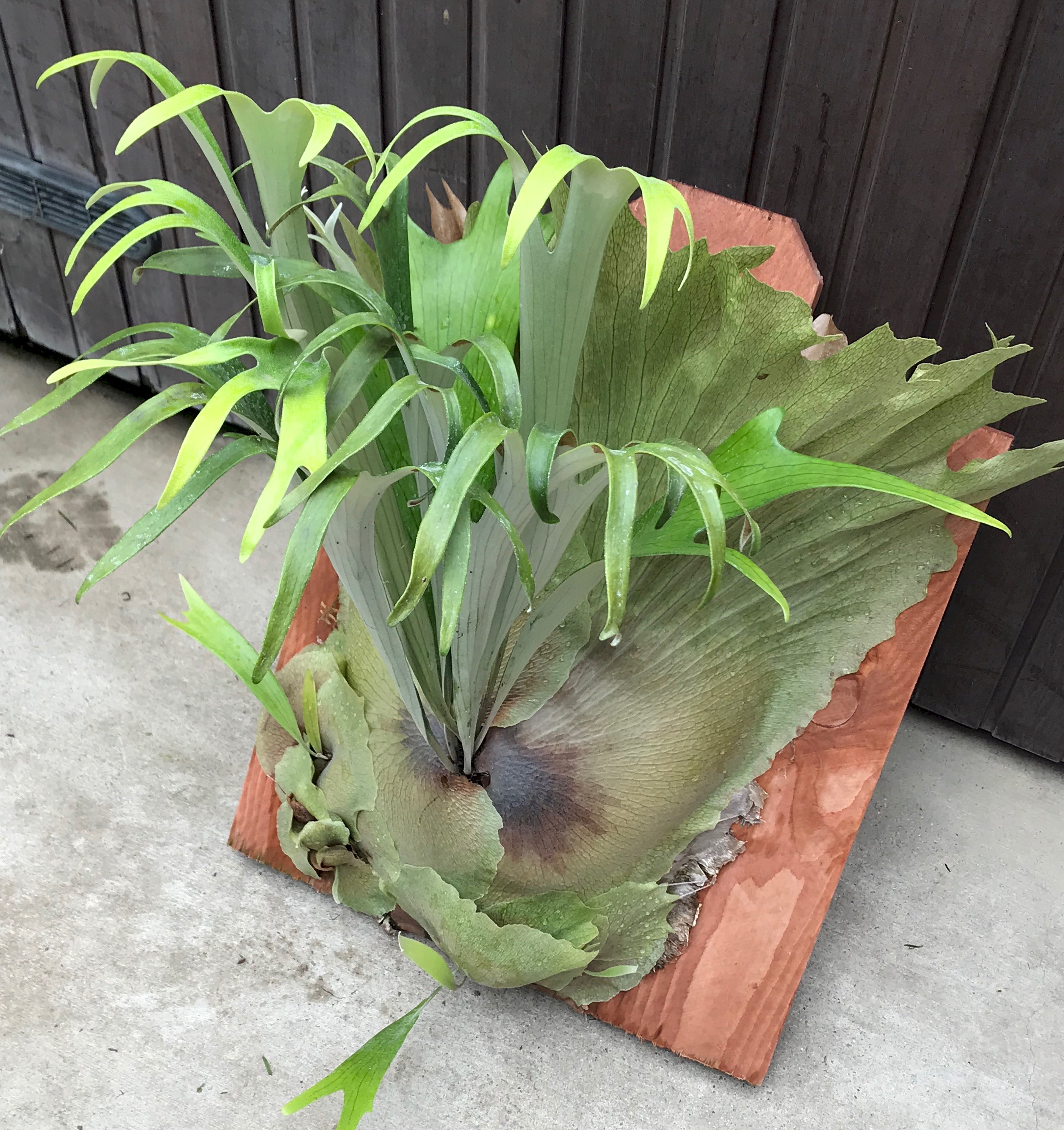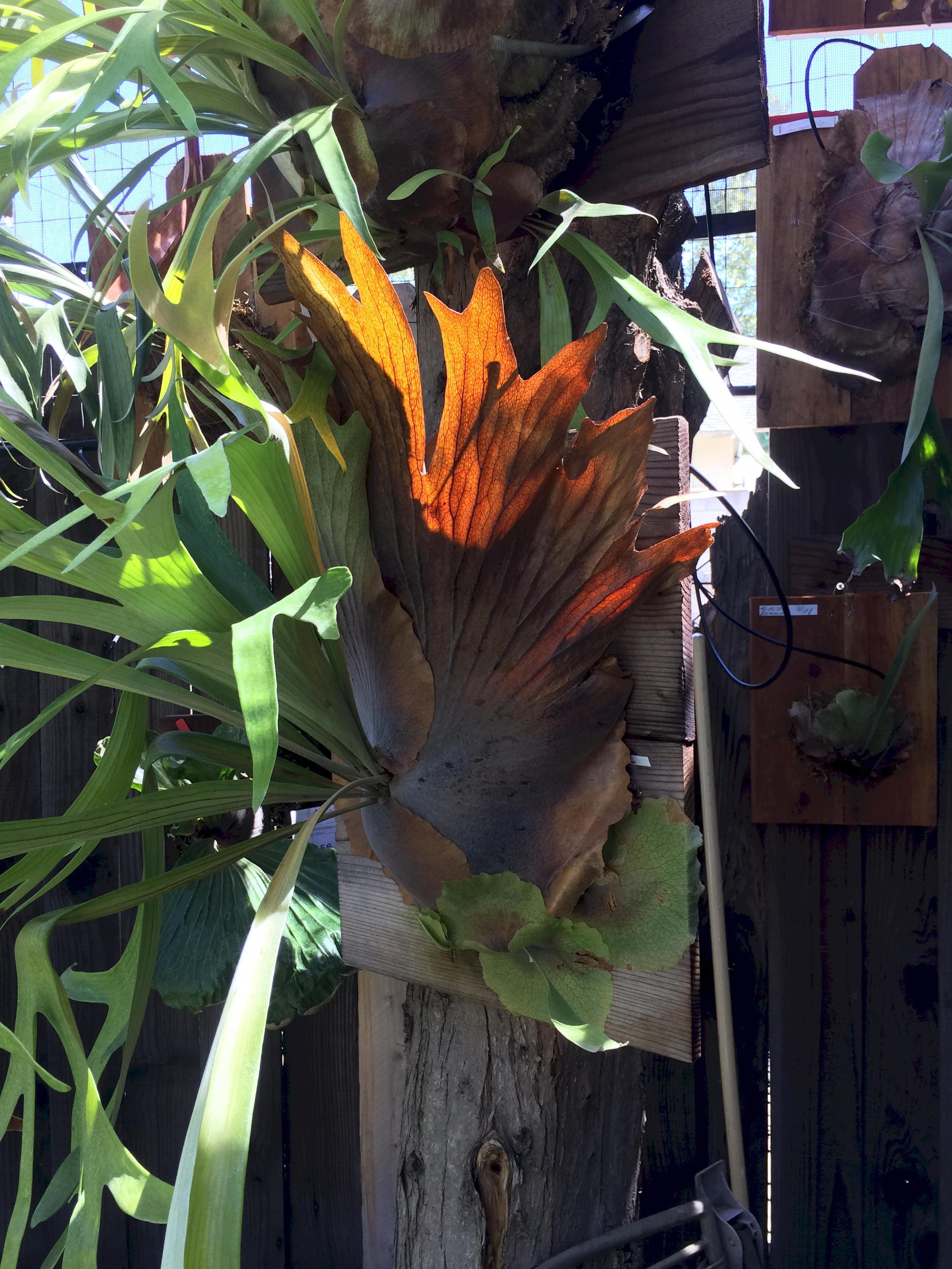 The shield fronds are a dark brown while the fertile fronds hang down in a typical P. willinckii manor. The fertile fronds are wide like a P. hillii and with short fingers like a P.hillii 'Hula Hands". But this is definitely a willinckii that is not documented in any of the platycerium books I have read.
