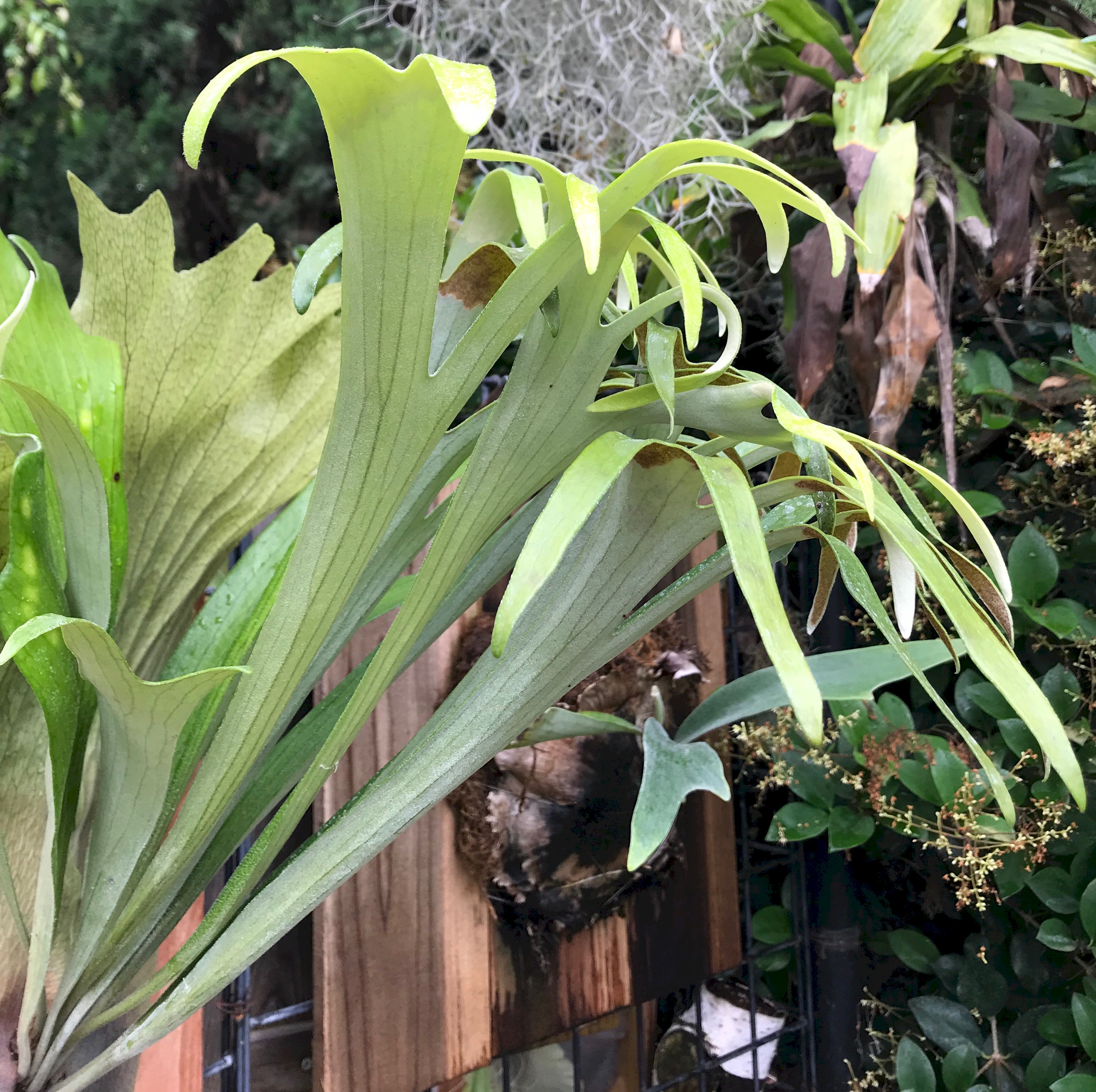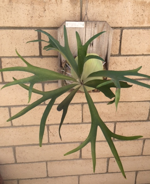 Platycerium willinckii Fertile fronds gow our edgewise then rotate and hang down. Beautiful contrast between the rich brown shield fronds and the whitish green fertile fronds. Mature willinckii may have 12 fertile fronds whereas the bifurcatum only has 6 fertile fronds.